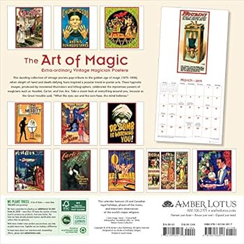 This dazzling collection of vintage posters pays tribute to the golden age of magic (1875–1930), when sleight of hand and death-defying feats inspired a popular trend in poster arts. These hypnotic images, produced by renowned illustrators and lithographers, celebrated the mysterious powers of magicians such as Houdini, Carter, and Von Arx. Take a closer look at everything around you, because as the Great Houdini said, What the eyes see and the ears hear, the mind believes. 12" x 12" wall calendar (12" x 24" open). A year of vintage magic show posters on your wall. The perfect gift for the magic or vintage poster enthusiast. Showcases poster art by renowned illustrators and lithographers. Features vintage posters from the Nielsen Magic Poster Collection. Frameable artbook-quality printing. Printed on paper sourced from a combination of sustainably managed forests and recycled materials. Published by Amber Lotus, an independent carbon-negative US company that has planted more than half a million trees since 2008. This calendar features US and Canadian legal holidays, phases of the moon, and important observances of the world's major religions.